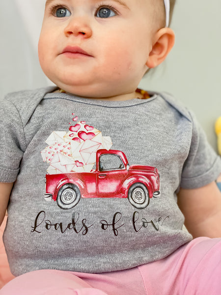 How fun is this Loads of Love Valentine’s Day top!? Valentine’s Day is just around the corner, & your little definitely needs this in their closet. Christmas trucks are fun & now there’s an awesome Valentine’s truck option too!! I love that it’s great for girls & boys too!