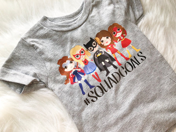 how fun is this #squadgoals top!? Love all the superwomen on it! This would make a great gift, or a great addition to your own littles closet! Grab your tee or bodysuit today!!